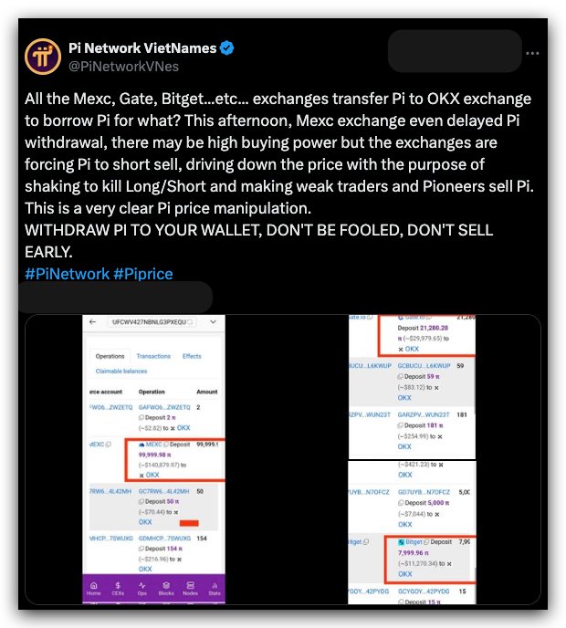 The viral post claimed that exchanges like Mexc, Gate, and Bitget were transferring Pi to OKX to borrow Pi and conduct short selling. This strategy allegedly aims to push Pi’s price down, causing retail traders and Pi pioneers to panic and sell off their assets.