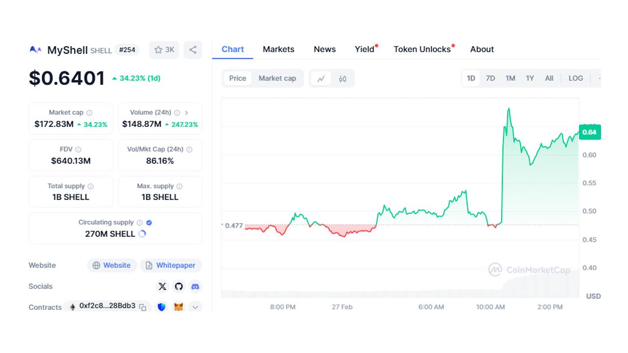 While speculation about Pi Coin continues, MyShell ($SHELL) has already experienced a sharp rise. Following its official Binance listing announcement, MyShell’s price surged 34.23% in one day, with a 60% weekly increase, currently trading at $0.6401. Several factors have contributed to this price spike: