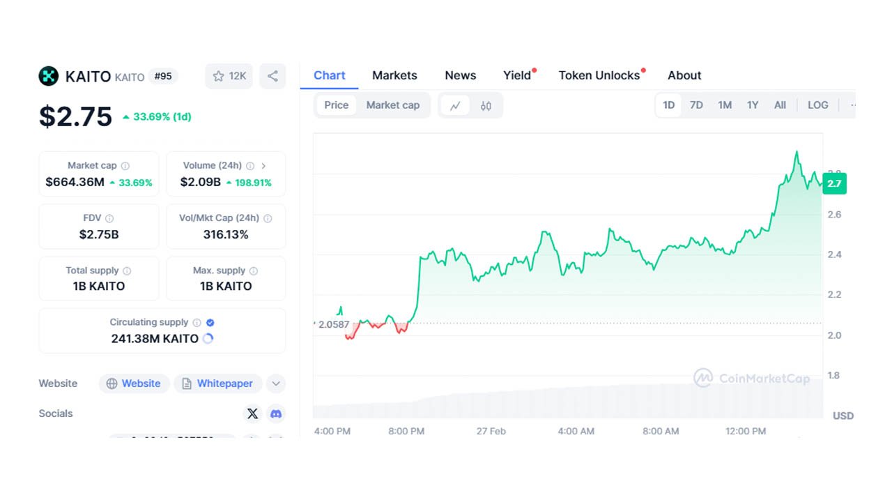 Kaito Crypto ($KAITO) is another token experiencing a remarkable surge, currently at $2.75 with an intraday jump of 33.69% and a 135.55% weekly increase. Key factors driving this growth include: